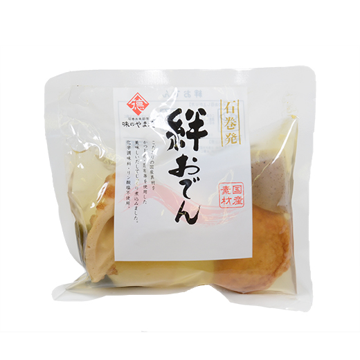 宮城県石巻港発の「絆おでん」は魚の練り製品を製造してきた山徳平塚水産が心を込めて作りました。国産の厳選素材をかつお節、昆布等の天然素材だけで作ったスープでじっくりと煮込みました。パウチをそのまま湯煎で、または容器に移して電子レンジですぐに食べられる簡単調理です。化学調味料、リン酸塩等の食品添加物無添加のこだわりおでんを是非お試しください。〜種類〜