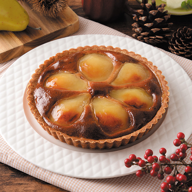 秋のタルトとして人気の高い「洋梨ち栗のタルト」を通信販売のお客様にお届けいたします。サクサクのタルト生地の上に、アクセントのキャラメルとくるみ、栗のペーストとアーモンドクリームを入れ、大きくカットした洋梨のコンポートをのせ、焼き上げました。風味豊かなタルトとみずみずしい洋梨のマリアージュが新鮮です。ぜひお楽しみください。商品情報