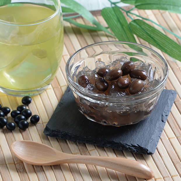 寒天にふっくらやわらかな北海道産黒豆を合わせ、黒糖と本葛を使用したコクのある味わいです。ふるふるとした食感が特徴。舌触りがなめらかで、喉越しが良く、さっぱりと食べられるおやつとしておすすめです。商品情報