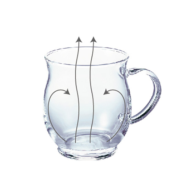 アイスもホットも使用できる耐熱ガラス製のマグカップです。丸みをつけたデザインは、カップの中の空気の対流を促し、カップから出る香りを口元に集めるので、飲み物の香りをより楽しむことができます。